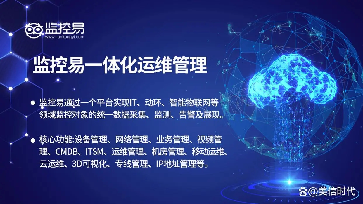 监控易是美信时代自研的一体化数据采集与洞察管理平台,通过一个平台实现IT、动环、智能物联网三大领域的统一数据采集、巡检、监控、告警及展现,提供设备管理、网络管理、业务管理、视频管理、CMDB、ITSM......