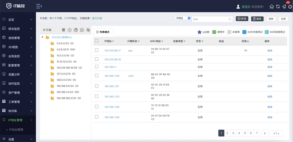 监控易IP地址管理可以展示IP地址与MAC地址的对应关系, 可以查看在用、未用的地址,也可以查看地址的分配、保留状况。
