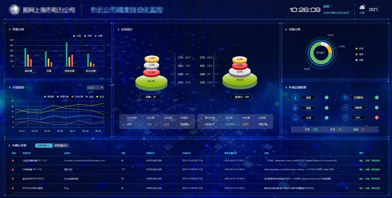 结合3D机房大屏,系统将物理设备与逻辑拓扑融合呈现: