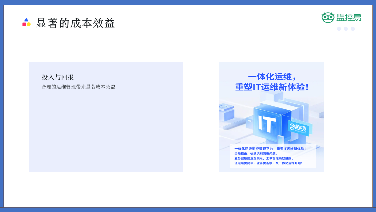 这正是部分运维平台所希望能够达成的目标,以北京美信时代监控易这类产品为例,它的价值已经超越了实时告警。它宛如一家“数字银行”,为你的三个“未来账户”给予初始资金以及运营平台。