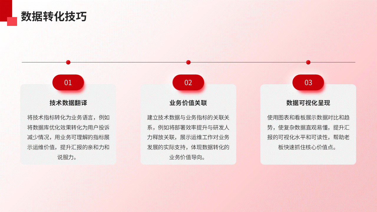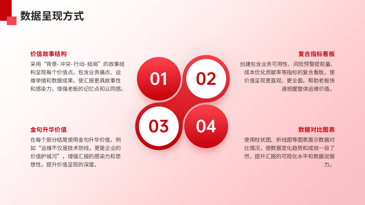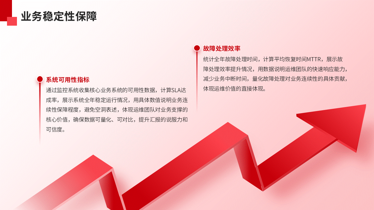- 结构上:用“价值故事”替代“工作清单”。每个核心价值点都可以编成一个“短篇小说”,包含“背景(业务痛点)-冲突(面临的挑战)-行动(运维举措)-结局(数据成果)”四个部分,配上关键指标前后对比图,老板一眼就能get到核心。