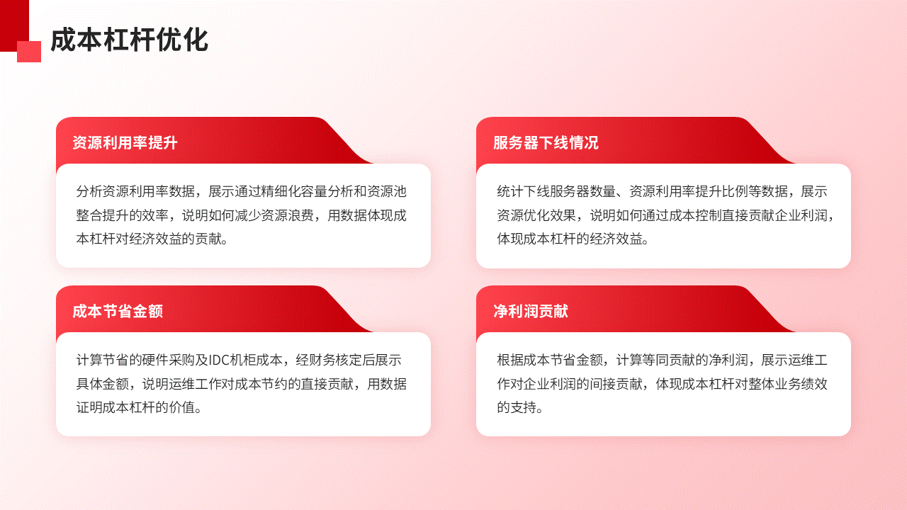 - 我们以前可能写“优化了服务器资源”,现在呢要写“通过精细化容量分析和资源池整合,分三批次下线58台低负载服务器,将XXX集群资源利用率从32%提升至65%,经财务核定,直接节省硬件采购及IDC机柜成本XX万元,等同于贡献YY万元净利润”。