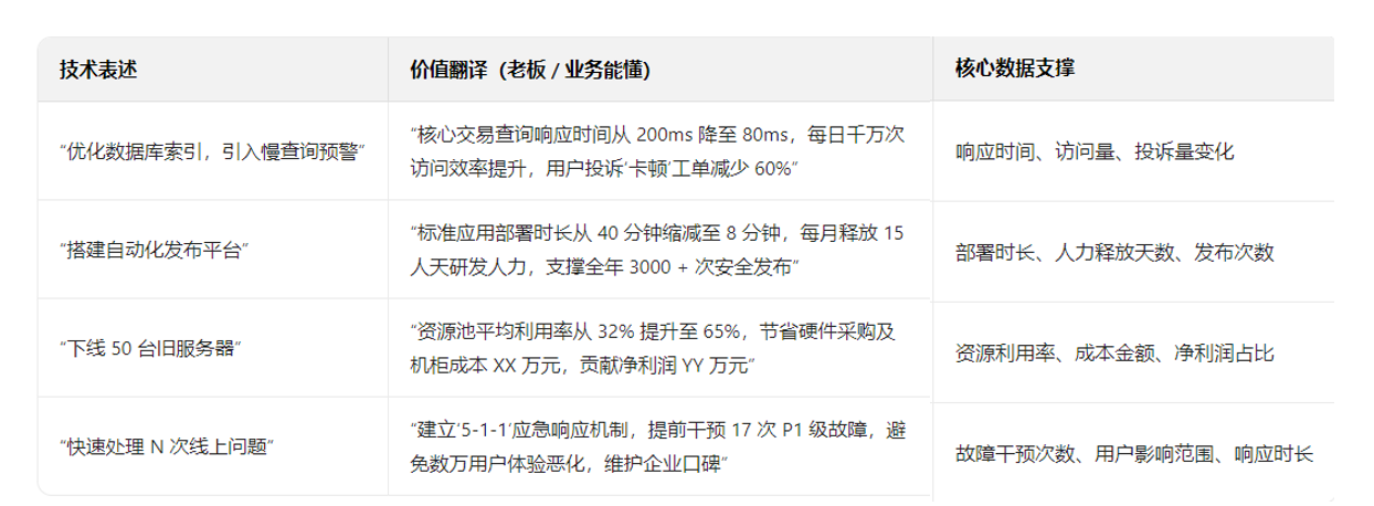 - 常规以往我们写“团队5人,维护200台服务器”,要写“借助标准化运维脚本库和自动化部署平台,团队人均运维设备从280台提升至420台,业务系统增长30%的情况下,团队规模零增长,完全依靠效率消化增量”。