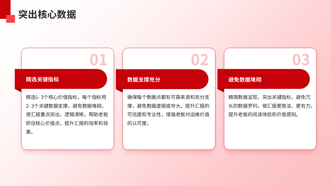 2. 误区二:数据堆砌,没有重点。精选1-3个核心价值指标,每个指标用2-3个关键数据支撑,过多数据会让老板抓不住重点。