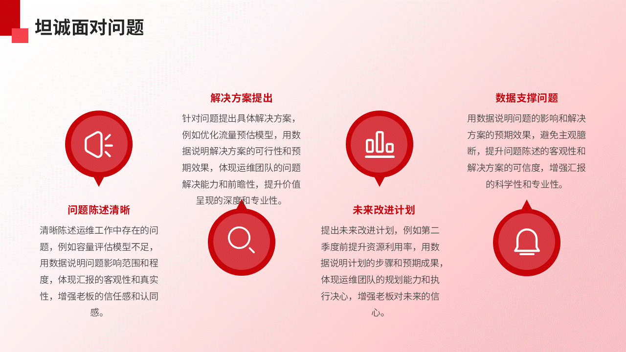 3. 误区三:只说成绩,回避问题。敢于提问题,但要带着思考和解决方案。比如“容量评估模型在突发场景考虑不周,我们已优化流量预估模型,明年春节将投入使用”,这会让老板觉得你靠谱、有成长。