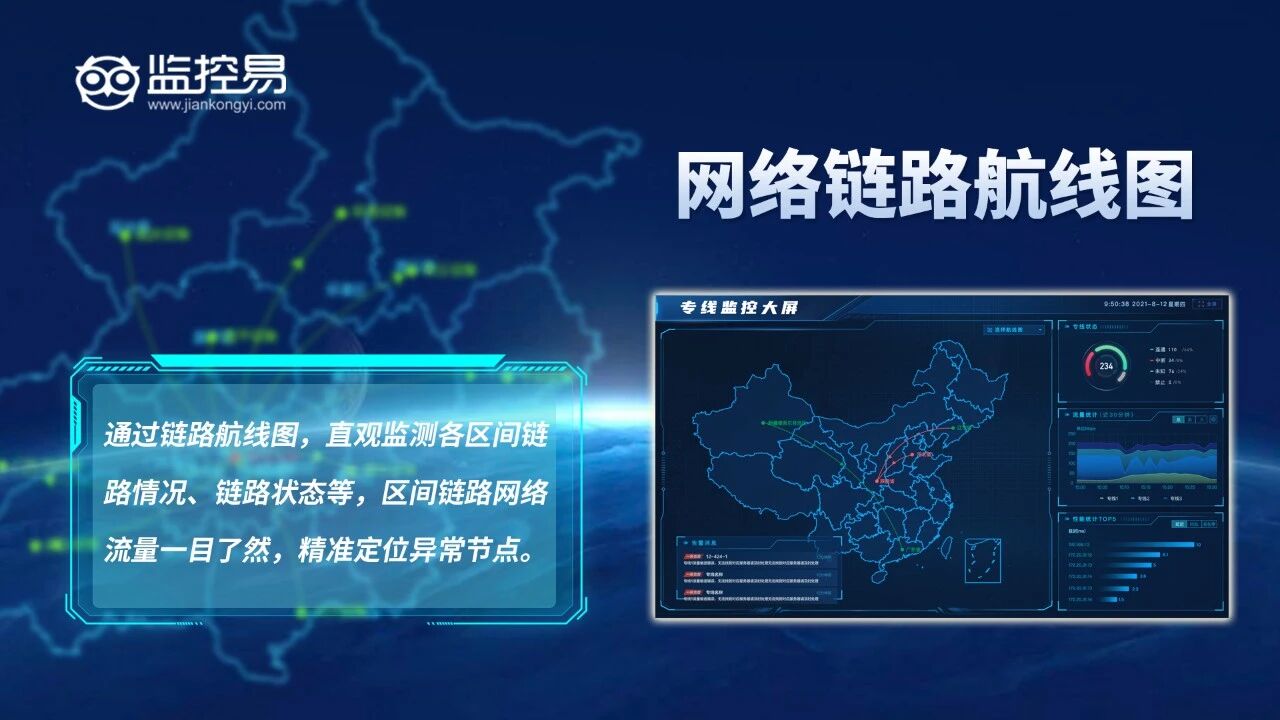 其次,链路航线图以地图形式展示跨区域网络链路状态,实现端到端可视化监控。无论是专线中断还是延迟升高,均可在地图上直观呈现,并支持向上聚合、向下钻取,既适合一线工程师排查细节,也便于管理层掌握整体网络健康度。
