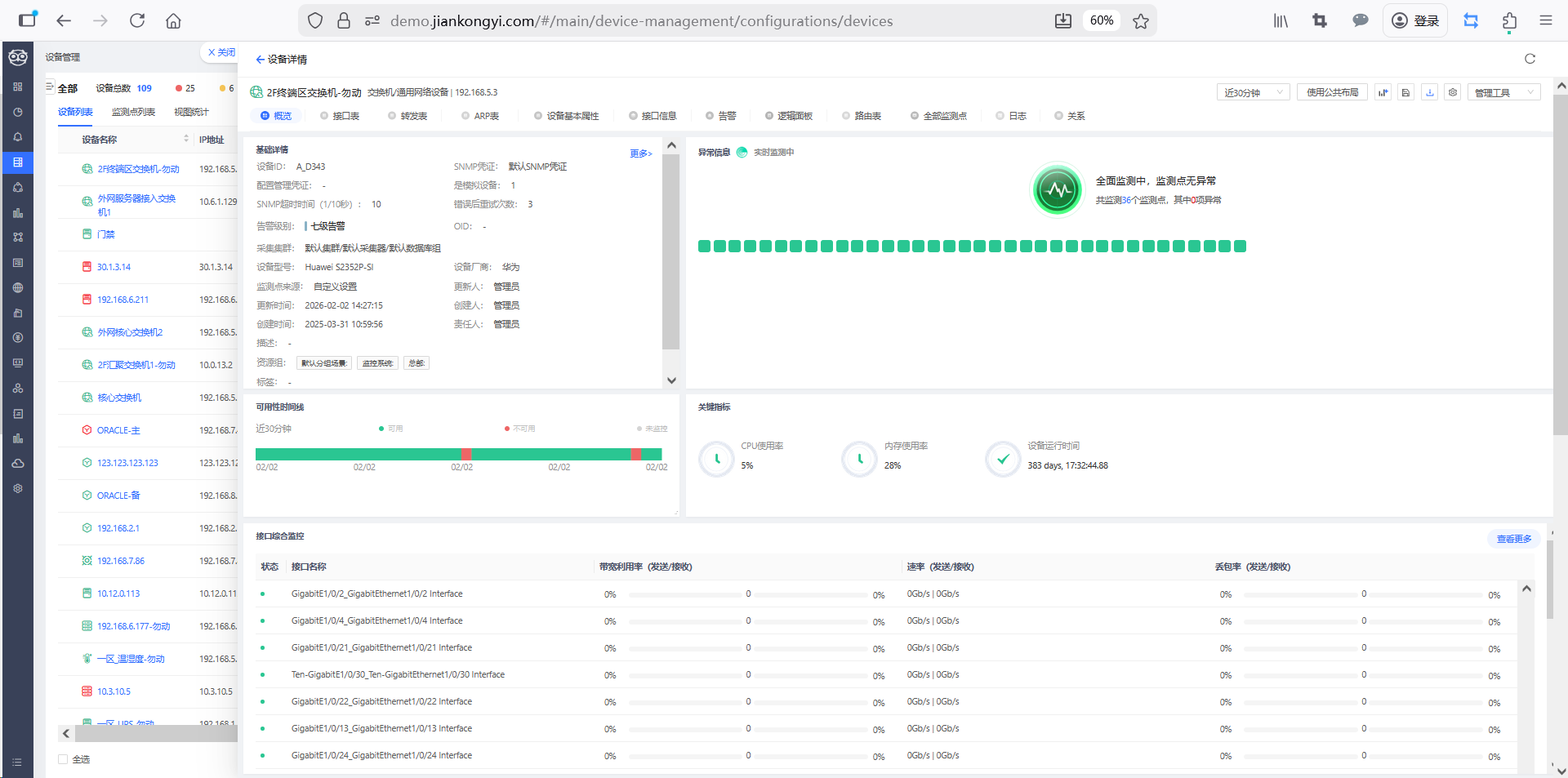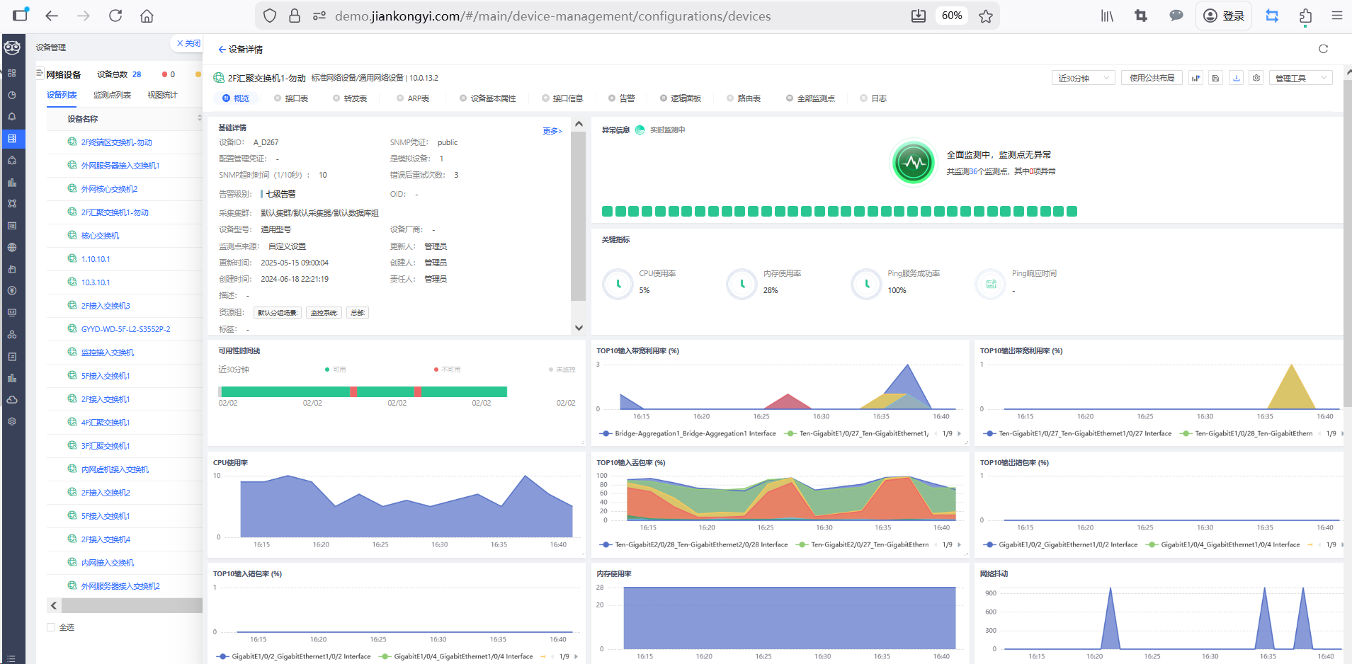 对于网络设备,除CPU、内存等基础资源外,重点监控接口状态与配置变更。平台支持通过多种协议进行监控。在监控界面中,可以清晰查看每个接口的UP/DOWN状态、流量数据。点击具体接口,能进一步查看接收/发送流量、数据包、丢包、错包、广播包及带宽使用率等详细指标。状态告警既可基于接口通断,也可基于流量阈值触发。