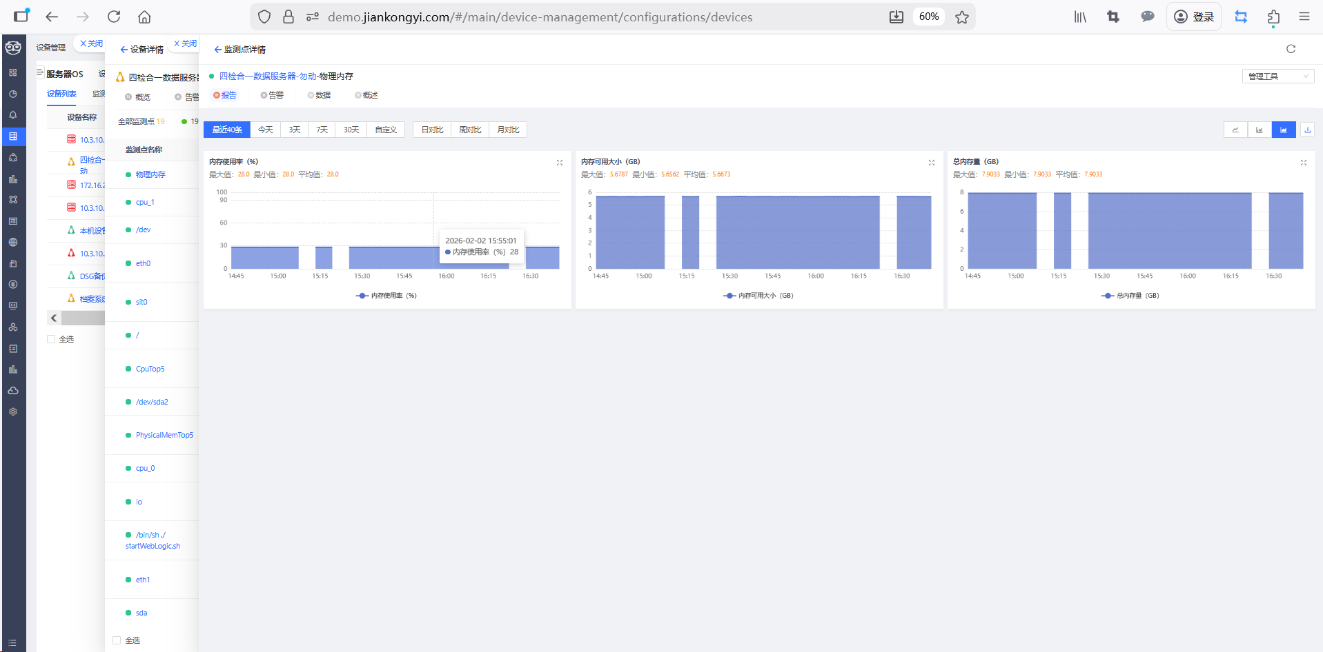例如,监控内存信息时,界面会显示当前数值、历史趋势图,并通过颜色变化提示阈值状态。点击“详情”可进入小报表,查看以时、日、周、月为维度的对比趋势图。报表数据均为实时汇总,代表性高。