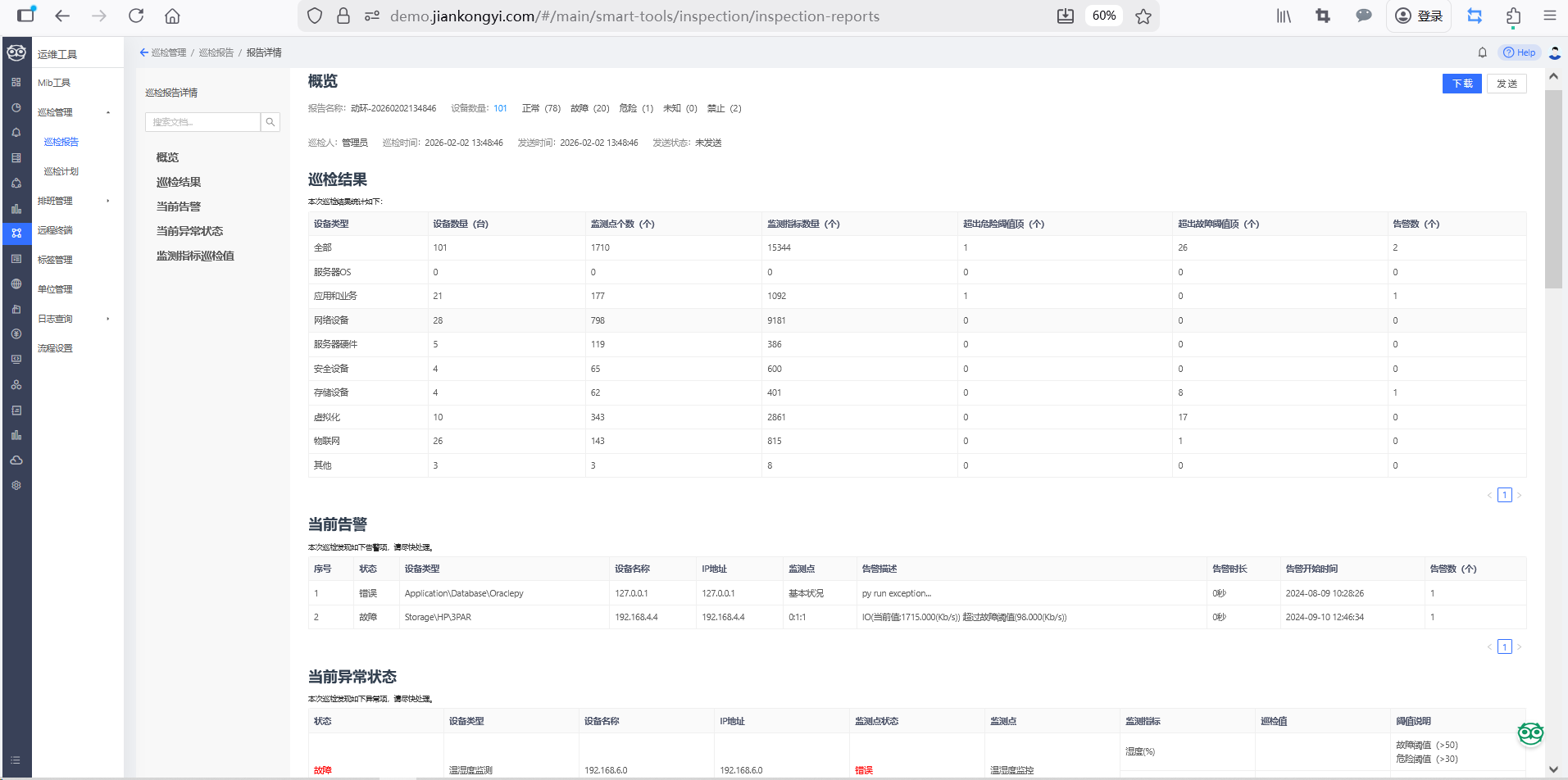 2. 自动巡检报告:此功能解决人工巡检耗时问题。您可配置巡检人员、周期、格式和范围,平台将自动生成巡检报告并发送至邮箱或供页面查看。报告内容包括巡检概览、人员时间记录、结果统计(如告警数量)及详细数据,支持导出 Excel、PDF 等格式,便于留存。