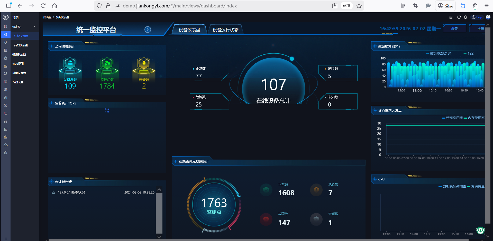 1. 设备仪表盘:从设备维度展示纳管全局,可全屏投放。内容涵盖设备总数、告警数量、状态分布及重点指标趋势。可直接点击告警数字,跳转查看详情。