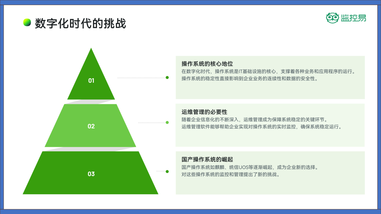 时代在呼唤运维的升维。对于肩负重大社会责任的行业而言,构建一个如同“中枢神经系统”般的一体化智能运维平台,已从“锦上添花”变为“雪中送炭”。它让不可见的风险变得可见,让不可控的复杂变得可控,让不可测的价值变得可测。监控易愿与各行业同仁一道,以坚实的技术与清晰的理念,共同筑牢数字时代的业务韧性基石,护航国之重器,行稳致远。