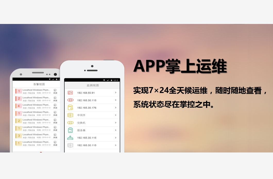 监控易同时提供移动APP应用,在手机、Pad上就可实现IT运维,让运维人员能够以最快的速度了解到系统健康状态,完全不受地理位置、软硬件设备等因素的制约,随时随地进行运维。