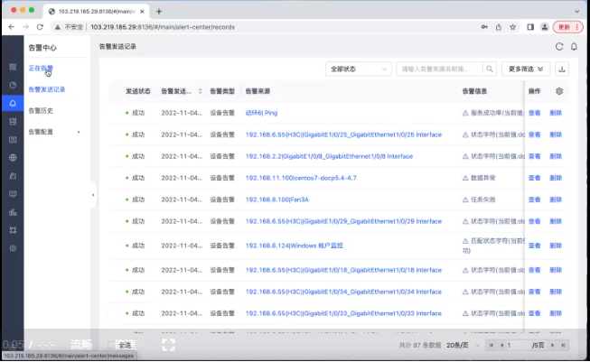 点击左侧菜单的“告警中心”按钮——在左侧“告警中心”下方选择“正在告警”,可看到左侧的“告警级别”。“告警级别”根据颜色划分等级,从上到下依次为“一级告警”,“二级告警”,“三级告警”,“四级告警”,......